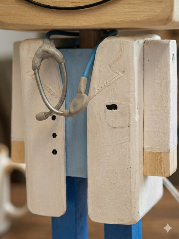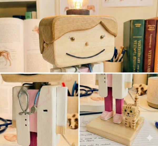 Celebra la noble vocación de cuidar a nuestras mascotas con esta pieza realmente especial. Cada velador es una pequeña escultura funcional, meticulosamente construida y pintada a mano en madera, representando a un profesional de la salud animal acompañado de un adorable y fiel perrito. Es el detalle perfecto para añadir calidez, ternura y un toque de identidad única a tu consultorio, estudio o habitación.