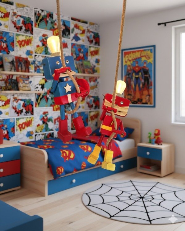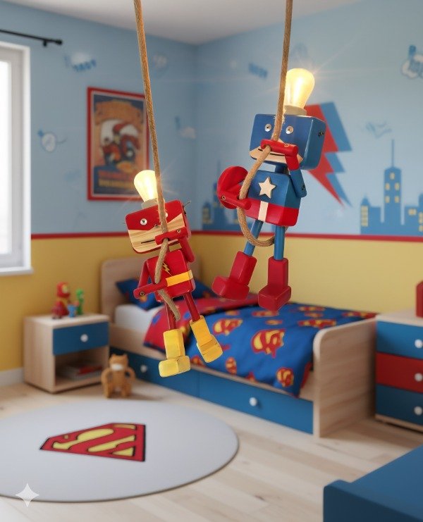 💥 ¡Doble poder en tu techo! 🦸♂️🦸♀️ Presentamos nuestra impresionante Lámpara Colgante Doble de Superhéroes Escaladores, el regalo original y la decoración perfecta para el dormitorio de tu pequeño héroe, la sala de juegos o cualquier espacio fanático. ✨ Una pieza única pintada a mano artesanalmente 🎨 que transformará cualquier ambiente. 🚀