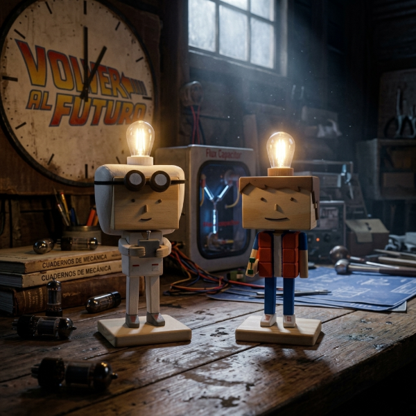 Cada pieza es una verdadera obra de arte, meticulosamente construida y pintada a mano en madera, capturando la esencia de los icónicos personajes Doc Brown y Marty McFly. No solo iluminarás tu espacio, sino que añadirás un toque único de nostalgia y estilo a tu hogar, oficina o estudio.