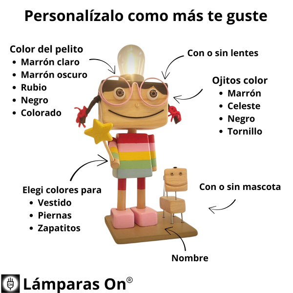 Podés elegir el color de la ropa, el color de pelo y los zapatos. Hacemos cada pieza única para vos.