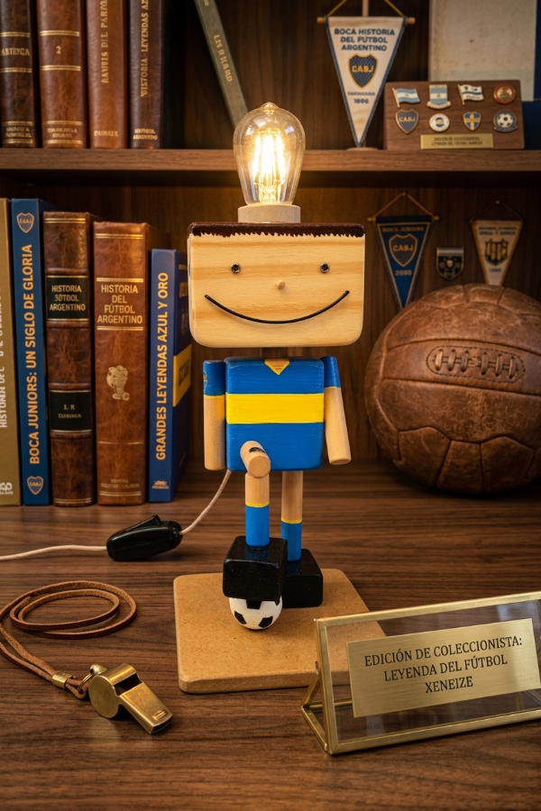 La figura del futbolista, llena de energía, está cuidadosamente detallada y pintada a mano, elaborada en madera de primera calidad. Con un diámetro de 12cm y una altura de 25cm (aprox.), su tamaño es ideal para tu mesa de luz, escritorio o estante. 📚